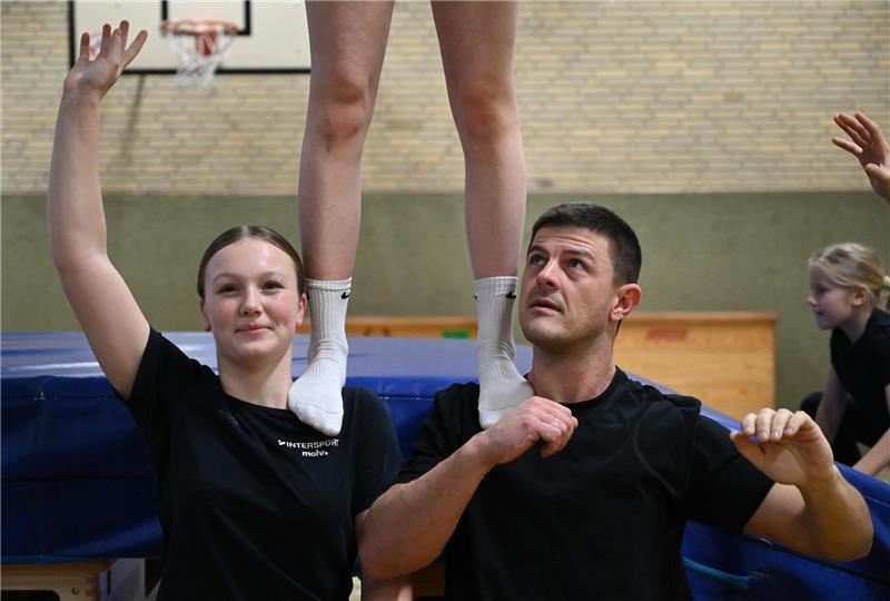 An einem Mittwochabend steht Passgang in der Sporthalle der Grundschule am Burggraben. Auf seinen Schultern steht ein Mädchen, das wiederum ein anderes Mädchen mit ausgestreckten Armen in die Höhe hebt, mehr als drei Meter über dem Hallenboden. Zur Sicherheit liegt eine weiche Matte bereit, doch die Figur gelingt.