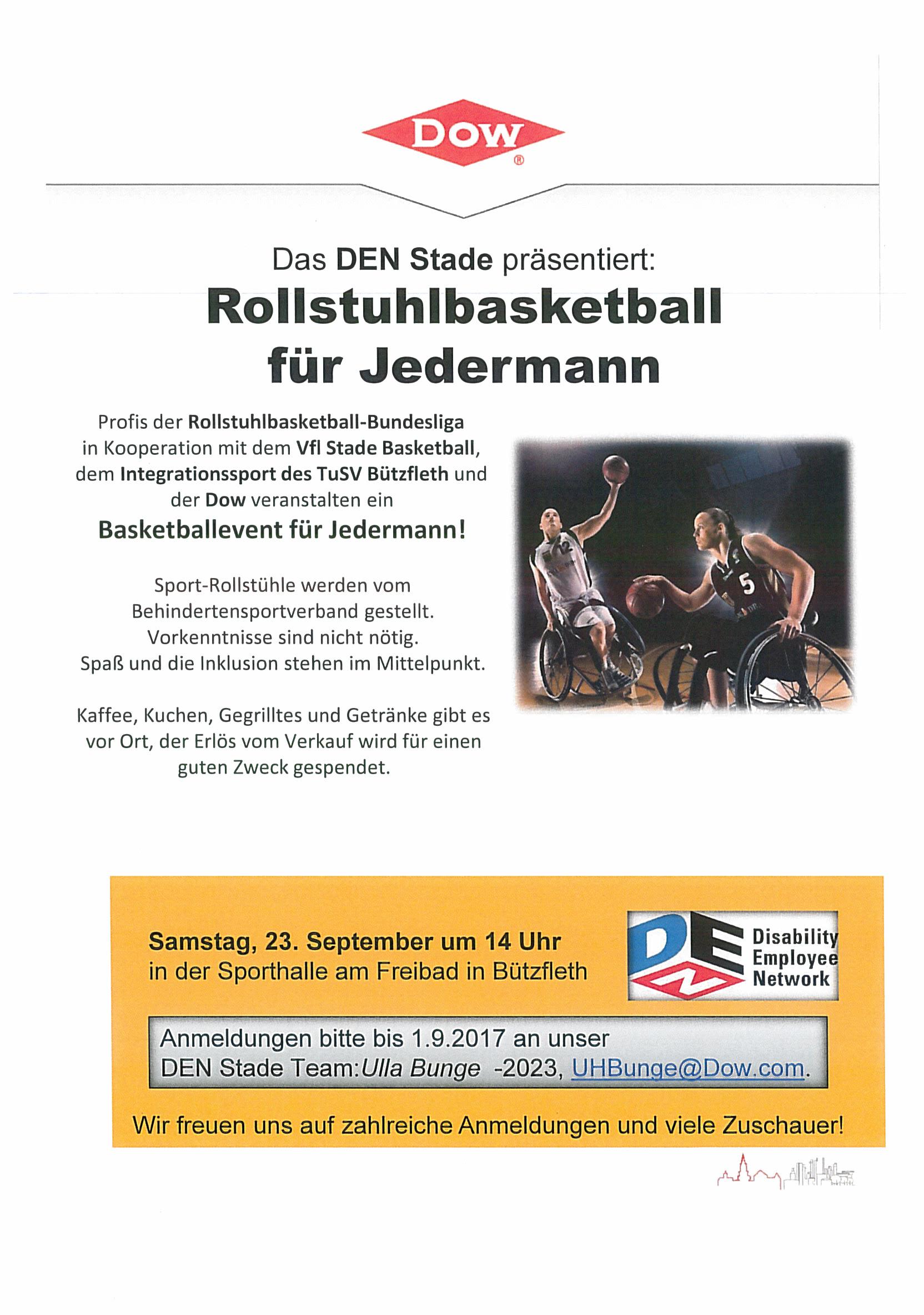 21.08.17 – Am 23. September geht es auf Korbjagd – und zwar im Sitzen auf zwei Rädern! DOW, VfL und DEN Stade präsentieren Rohstuhlbasketball für jedermann. Jeder, der sich einmal mit dem orangenen Lederball auf zwei Rädern versuchen möchte ist herzlich eingeladen. Vorkenntnisse sind nicht nötig. Anmeldungen bitte bis zum 1. September an Diese E-Mail-Adresse ist vor Spambots geschützt! Zur Anzeige muss JavaScript eingeschaltet sein!