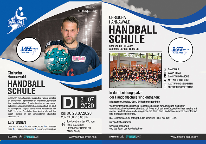 03.02.20 – Vom 21.07. - 23.07.2020 findet dieses Jahr in den Sommerferien die Handball-Schule mit Chrischa Hannawald statt. Alle Kinder im Alter von 8 - 14 Jahren sind herzlich Willkommen. Mitgliedschaft ist nicht notwendig. Anmeldung und weitere Informationen