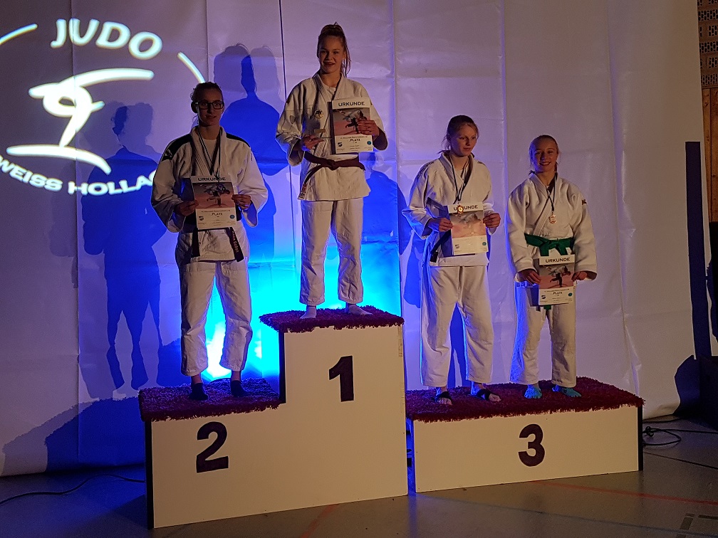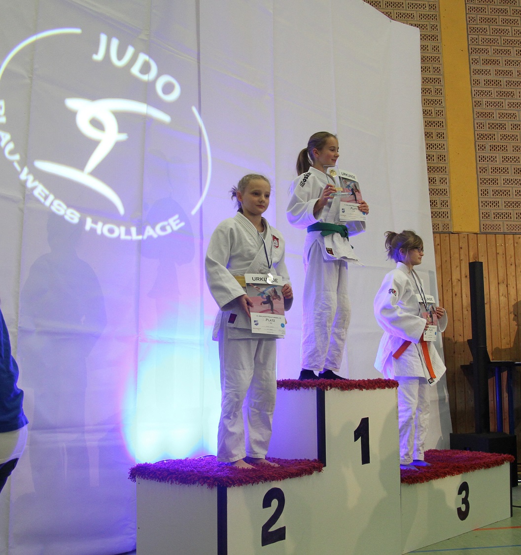 Die noch in der Altersklasse U12 startberechtigte 11-jährige Bente Zöllner kämpfte in Hollage erstmals in der Altersklasse U15, wo sie sich auf Anhieb bestens zurecht fand. Nach einem beherzten Kampf mit guten Aktionen gegen die spätere Siegerin Leny Schubert vom VFL Grasdorf sicherte sich Bente die Silbermedaille mit einem Haltegriff im Kampf gegen Sarah Peters von den „Judo Tiger Visbek“.