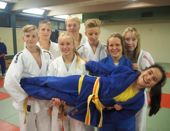 Judoka feiern sich und ihren Trainer