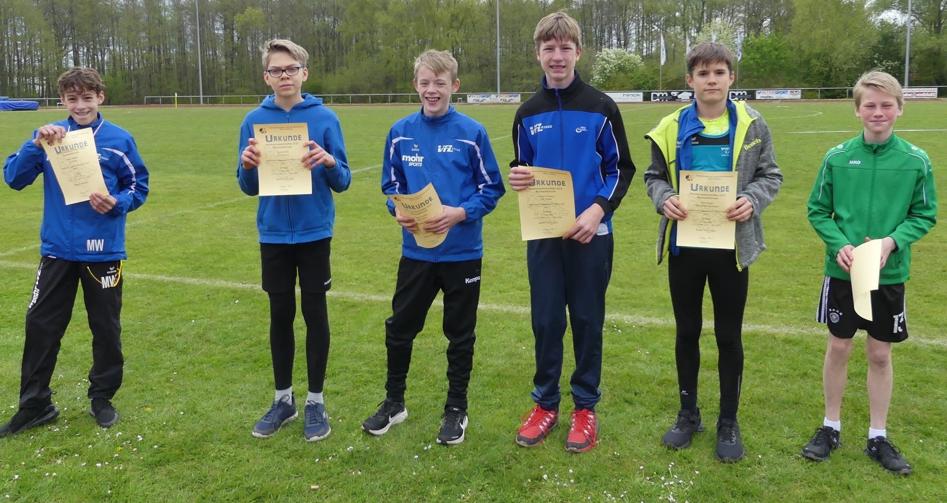 Plätze 1-6 männliche Jugend U14 Block Sprint/Sprung (vlnr): Mads Wigger (VfL Stade), Yannis Pahl (TV Sottrum), Jonas Lemke (VfL Stade), Florian Vorberg (VfL Stade), Elija Siggel (MTV Amelinghausen), Fabian Fröhlich (LSC Harsefeld)