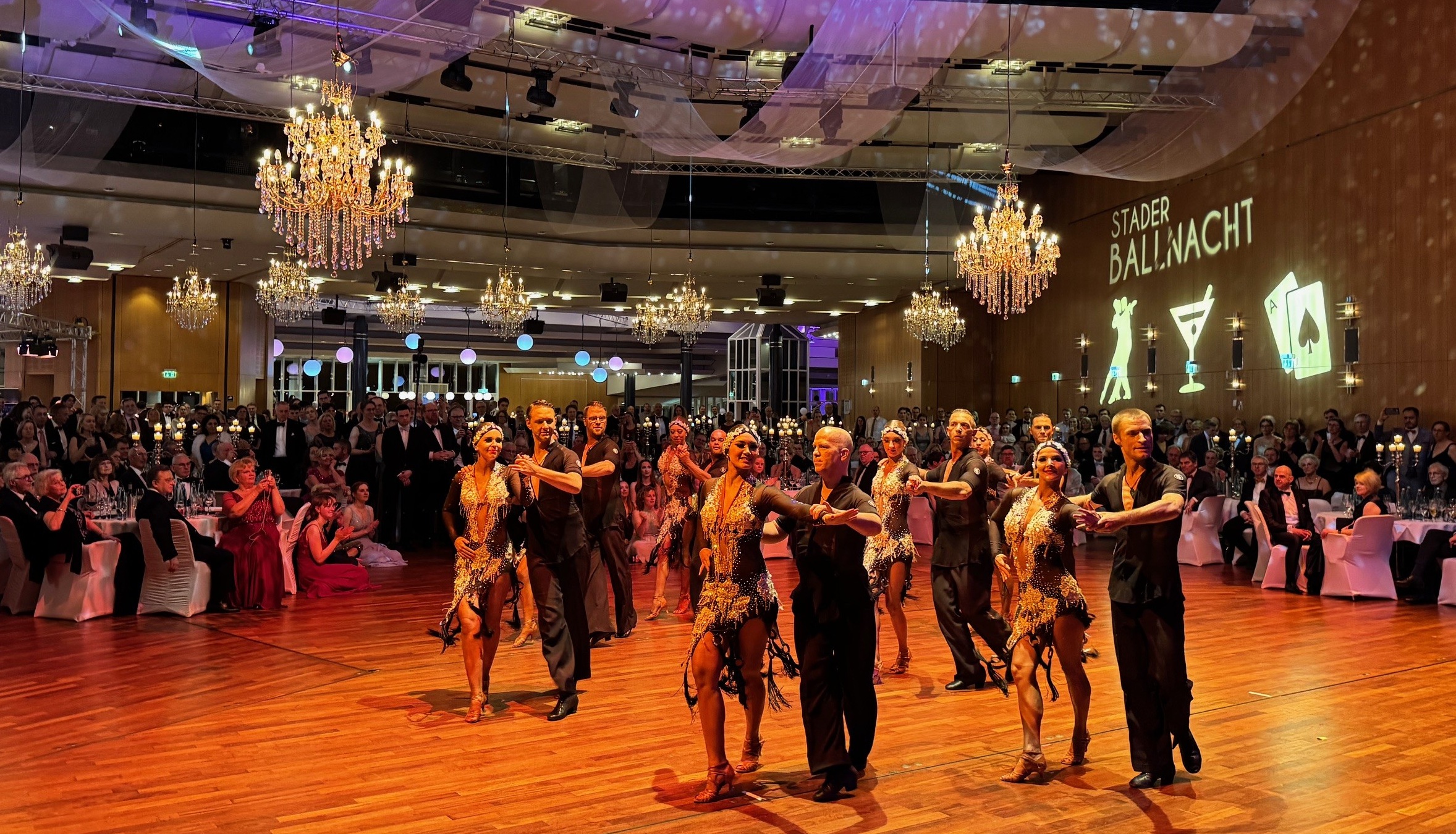 Direkt nach dem Turnier ging die Reise weiter zum Stadeum nach Stade, wo der Bus gegen 20:00 Uhr angekommen ist. Erstmals wurde dort die Stader Ballnacht ausgerichtet und eines der Highlights war die Show von unserer VfL Formation um 22:00 Uhr. Es war eine zauberhafte Atmosphäre im wundervoll gestalteten Stadeum - die Stimmung war hervorragend und der Auftritt sorgte auch im Team dafür, dass die Enttäuschung aus Kiel ein wenig vergessen werden konnte. Nach dem Auftritt feierte unsere Mannschaft noch bis tief in die Nacht die Premiere der Ballnacht und so wurde es für viele unserer Tänzerinnen und Tänzer ein 24 Stunden Tag mit einer Achterbahn der Emotionen.