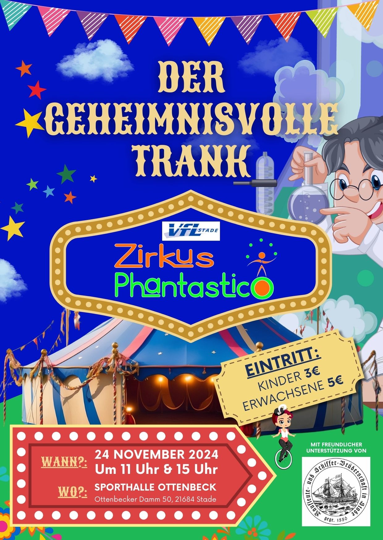 15.10.24 – Manege frei! Am Sonntag, den 24. November 2024 könnt ihr in unserem VfL-Sportzentrum wieder Zirkusluft schnuppern. Die Kinder und Jugendlichen von dem "Zirkus Phantastico" zeigen ihre neue Zirkusshow "Der geheimnisvolle Trank".