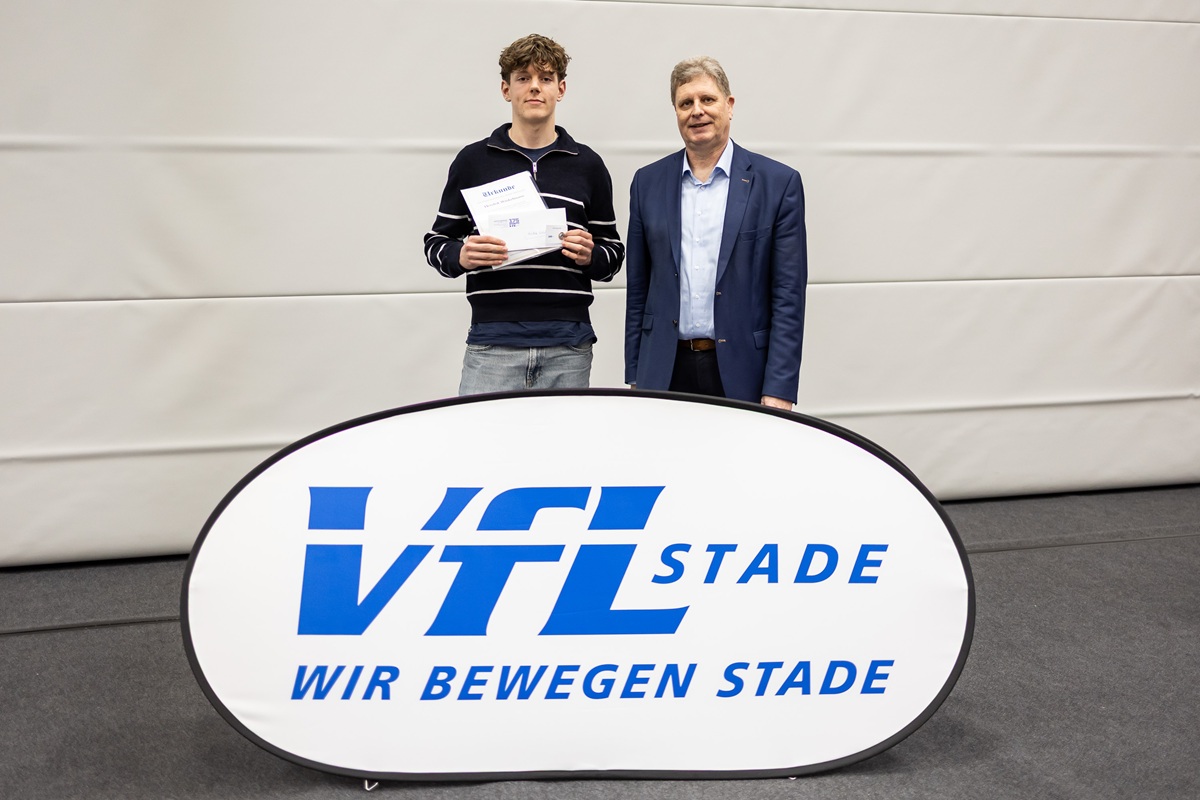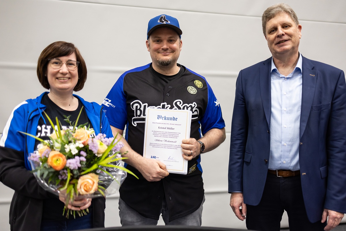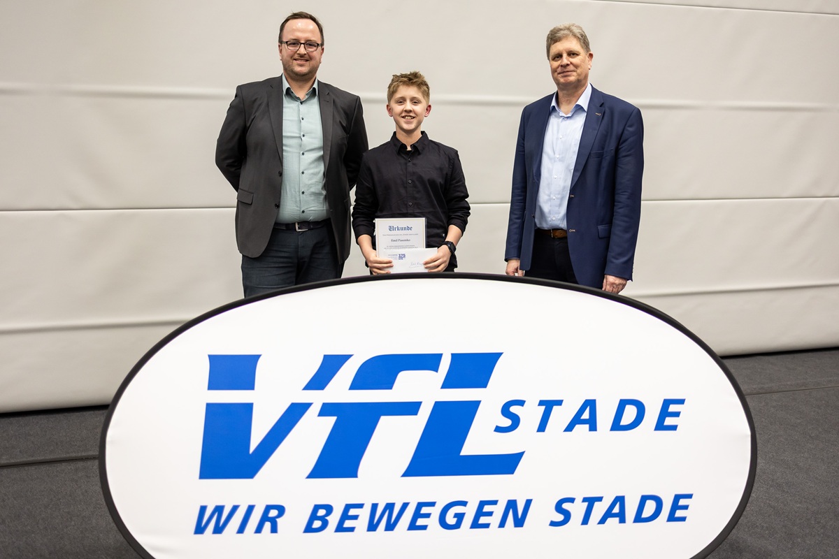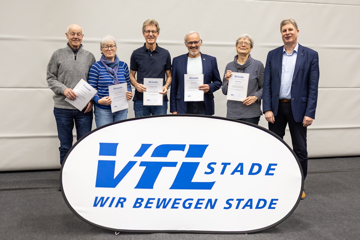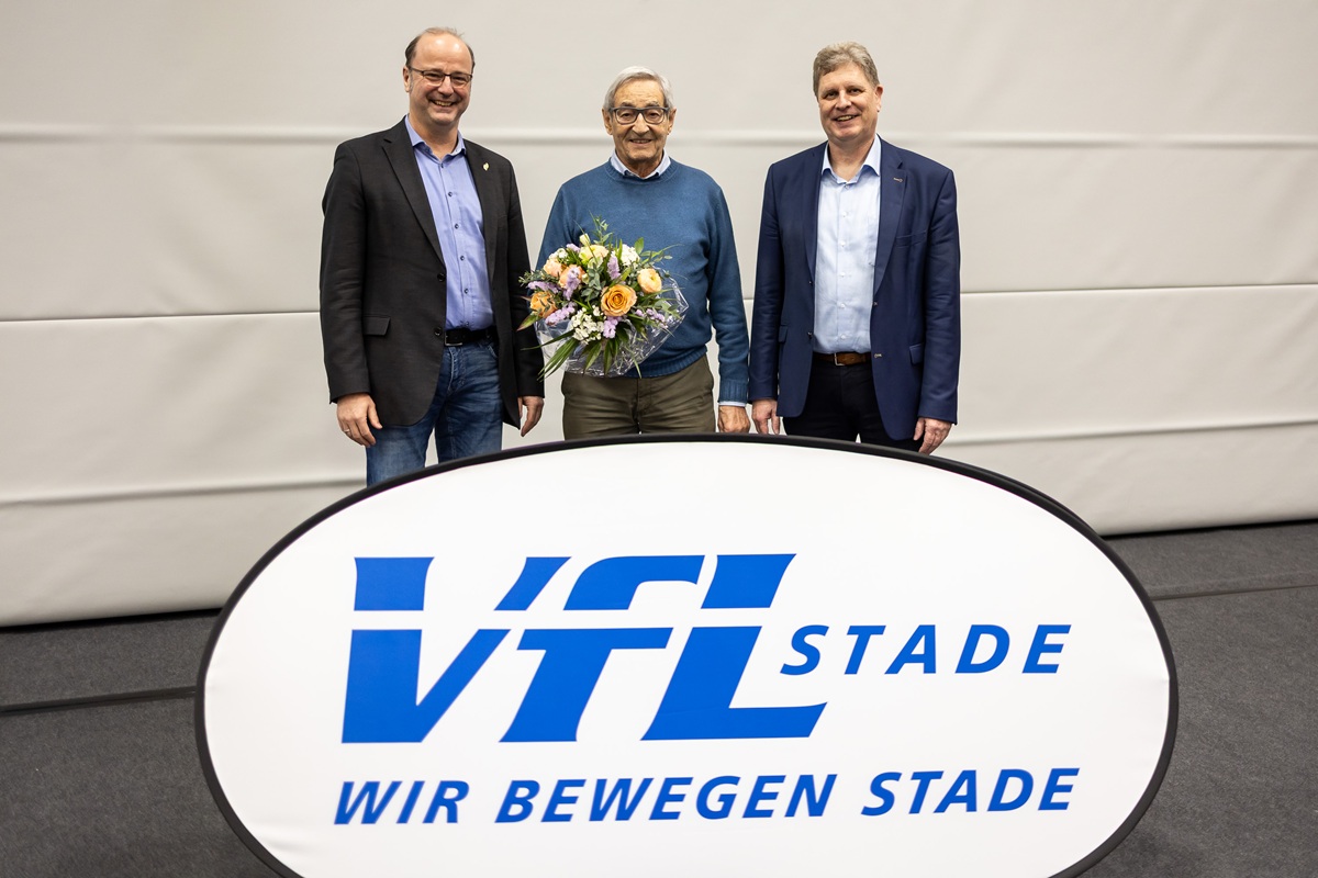 Das Präsidium des VfL Stade würdigt das herausragende und beständige Engagement von Horst Wiebusch, Rudi Steinkamp und Jens Wiebusch (v.l). Als Zeichen der Dankbarkeit und Anerkennung wurde ihnen die Ehrenmitgliedschaft des VfL Stade verliehen. Mit dieser Auszeichnung bedankt sich der Verein für ihre treue Unterstützung, ihr vorbildliches Engagement und ihren bedeutenden Beitrag zur Vereinsarbeit.