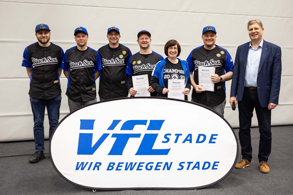Unser Baseballteam wird für eine äußerst erfolgreiche Saison geehrt. Es wurde sowohl Gesamt-Landesmeister als auch Meister der Staffel Landesliga Nord. Darüber hinaus zeichnet sich die Mannschaft durch besonders faires Spiel aus: Seit 15 Jahren hat kein Spieler einen Platzverweis erhalten. Den Sportler/innen wurde die silberne Leistungsnadel verliehen.