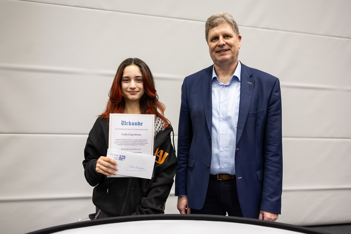 Leila Giacobone wurde für ihre herausragenden sportlichen Leistungen im Rollkunstlaufen geehrt. Im Jahr 2025 sicherte sie sich den Titel der Landesmeisterin und unterstrich ihr Können zudem mit einem hervorragenden 5. Platz beim Deutschen Breitensportpokal.