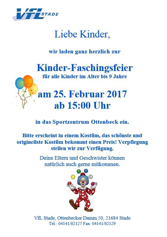 23.02.17 – Am kommenden Samstag, den 25. Februar findet um 15 Uhr unsere alljährliche Kinder-Faschingsfeier in der Sporthalle des VfL-Sportzentrums in Ottenbeck statt. Eingeladen sind alle Kinder bis 9 Jahre sowie Eltern und Geschwister.