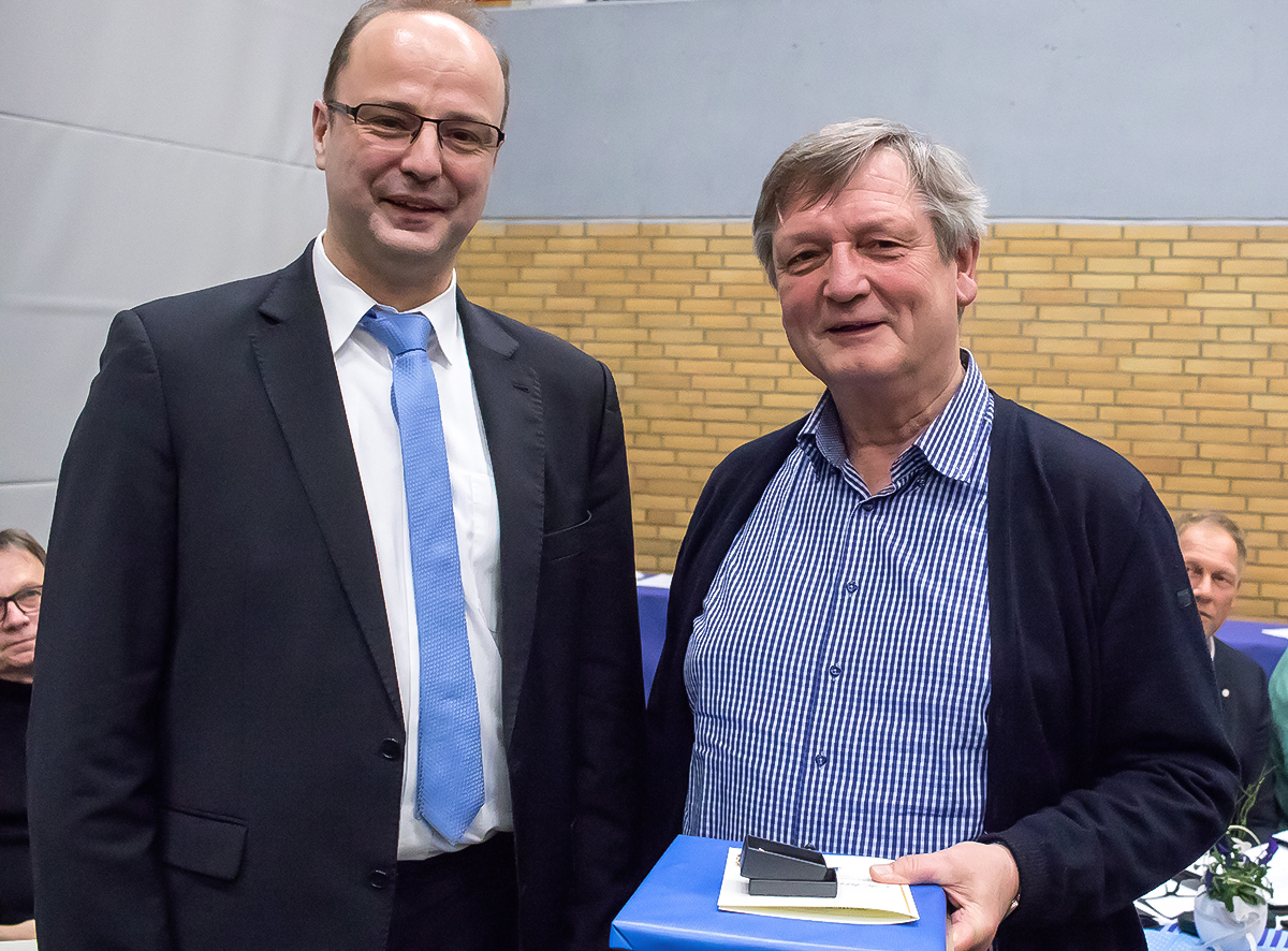 Ebenso hat sich Wulf-Peter Bruns (r.) über viele Jahre um den Handball im VfL Stade verdient gemacht. Ihm wurde neben der Verdienstnadel des Vereins auch vom neuen KSB-Vorsitzenden Knut Willenbockel die Ehrennadel in Silber des LSB Niedersachsen verliehen.