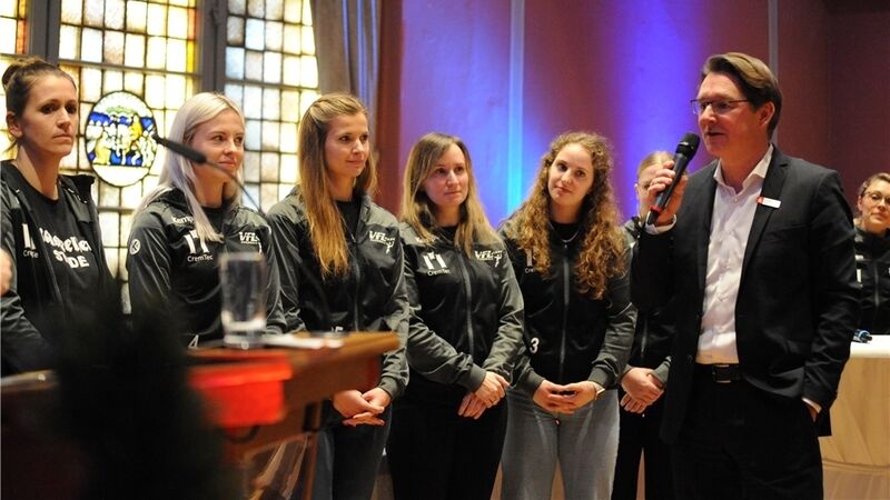 Sparkassenchef Michael Senf ehrt die Stader Handballerinnen. Foto: Berlin