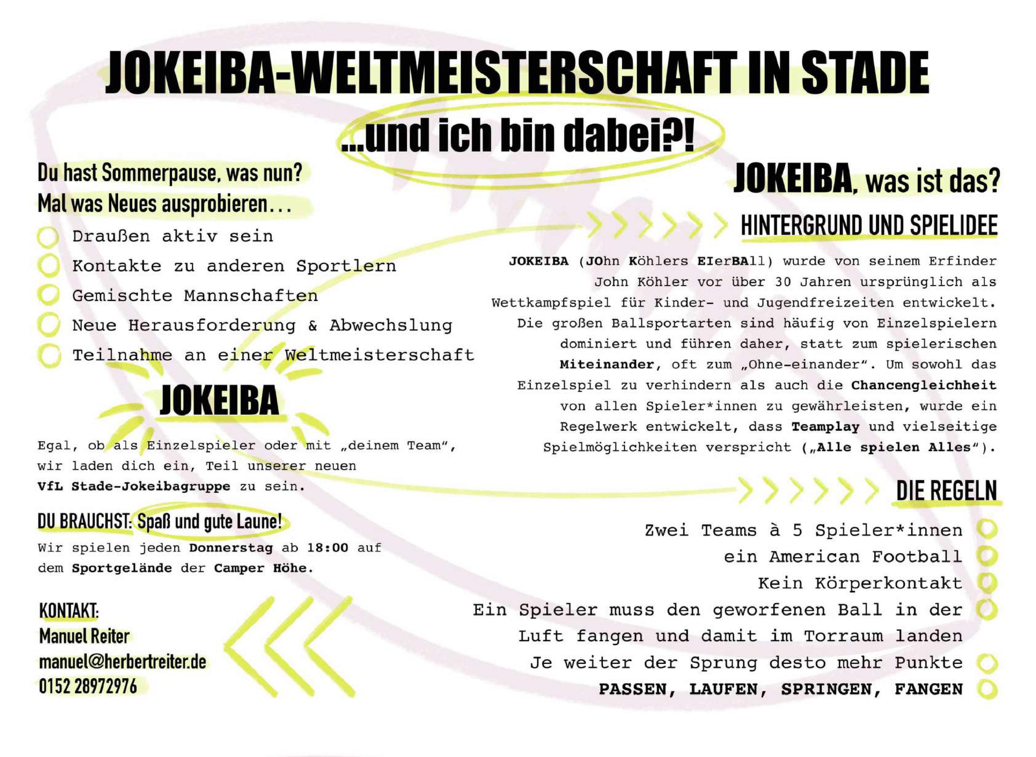 29.04.24 – Wir, der VfL Stade sind ein Verein, doch außerhalb unserer Abteilungen kennen wir uns leider kaum. Um dem entgegenzuwirken, wollen wir ein großes abteilungsübergreifendes Event veranstalten. Die verschiedenen Sparten des VfL sollen näher zusammenkommen. Und was bietet sich da besser an als ein Turnier?! Doch nicht irgendeins, sondern Jokeiba! Was Neues für alle!