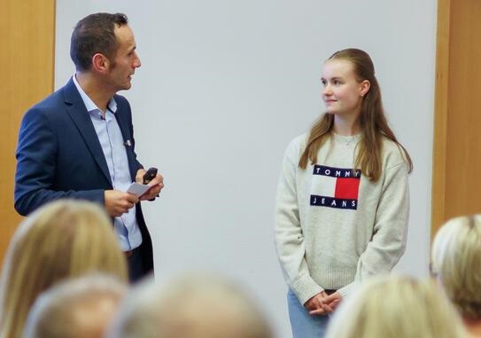 Nihat Sagir macht es spannend. Nachdem der Moderator die zehn Kandidatinnen und Kandidaten für das Sportstipendium interviewt hat, gibt er in der Präsentation auf der Leinwand nach und nach die Platzierungen bekannt. Erst die hinteren Plätze, dann die vorderen. „Mein Herz hat so doll geschlagen, weil ich die ganze Zeit nicht dabei war“, sagt Chiara Eggers.