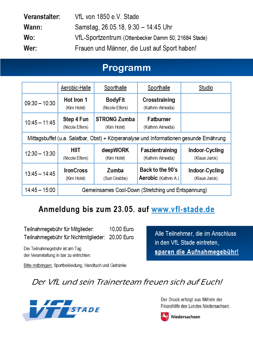 07.05.18 – Der 26. Mai steht im Zeichen des Sports und der gesunden Bewegung. Erlebt einen ganzen Tag Fitness beim VfL Stade! Unsere qualifizierten Übungsleiter laden euch zu Faszientraining, Indoor-Cycling, BodyFit, Zumba u.v.m. ein. Hier geht's zur Anmeldung!