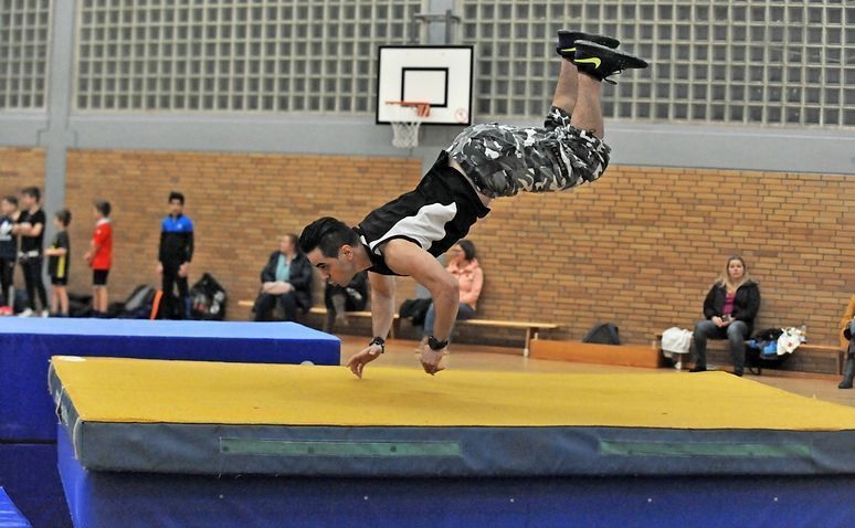 Calvin Leifried entscheidet sich für Ersteres. Der 13-Jährige fällt mit seinem dunklen Outfit, aber pinkfarbenen Schuhen, schnell auf. Er nimmt Anlauf und sprintet in großen Schritten auf das Hindernis zu. Mit je einem großen Satz tritt Leifried auf den ersten kleinen Kasten und fliegt dann förmlich weiter über die weiteren bis er auf der Weichbodenmatte angekommen ist. Dann dreht er sich um und macht mit einem Rückwärtssalto einen spektakulären Abgang. „Ich habe Spaß daran, andere Sachen auszuprobieren“, sagt Leifried, „und mich hat der Rückwärtssalto fasziniert.“ Seit circa einem Jahr ist er beim Parkour dabei.